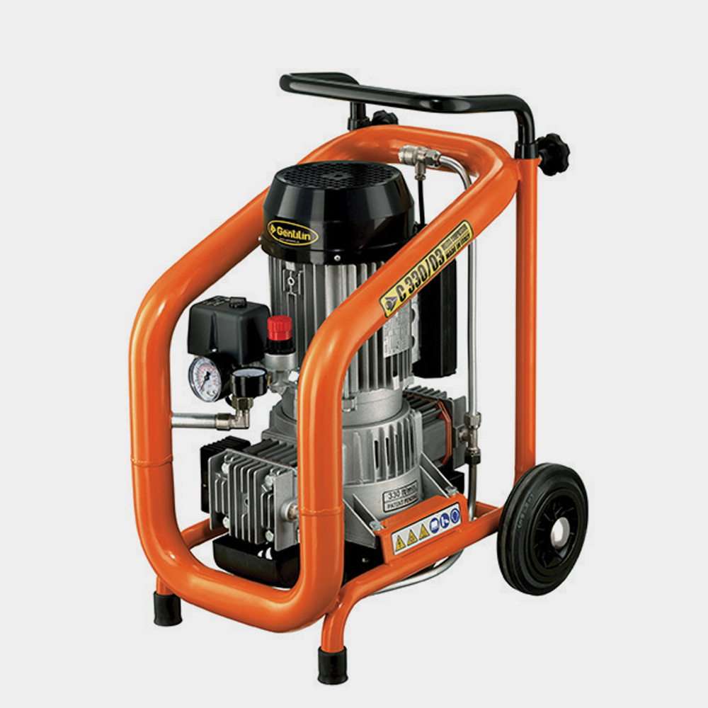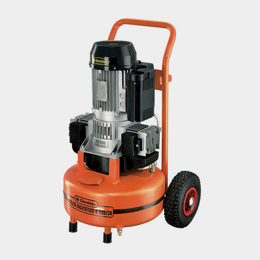 Elettrocompressore bicilindrico allestito su serbatoio con ruote ampiamente dimensionate, piedini e impugnatura di trasporto.
