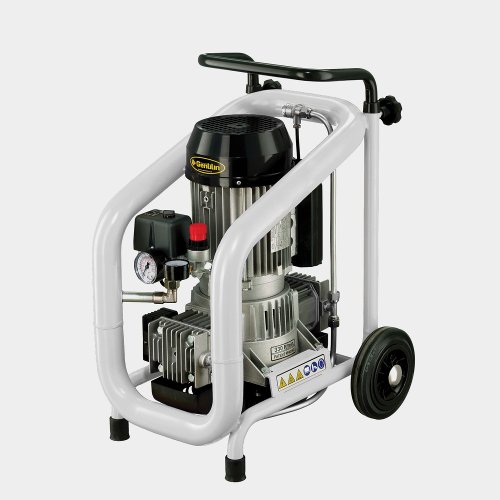 Elettrocompressore bicilindrico allestito su serbatoio tubolare con ruote ampiamente dimensionate,